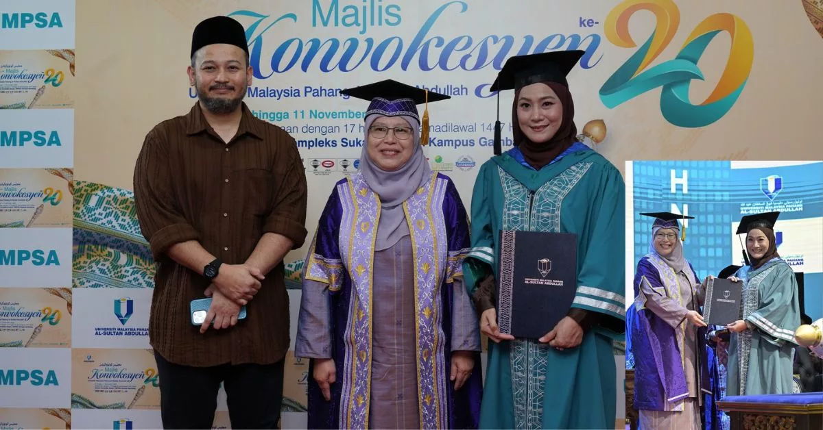 Yana yang ditemani ibu dan suaminya, Fadhil Zahari, tampil di Dewan Kompleks Sukan UMPSA dengan penuh senyuman untuk meraikan detik penuh bermakna selepas menamatkan pengajian di peringkat sarjana. Beliau menerima ijazah daripada Naib Canselor UMPSA, Prof. Dr. Yatimah Alias, dalam sesi kelima majlis konvokesyen tersebut.